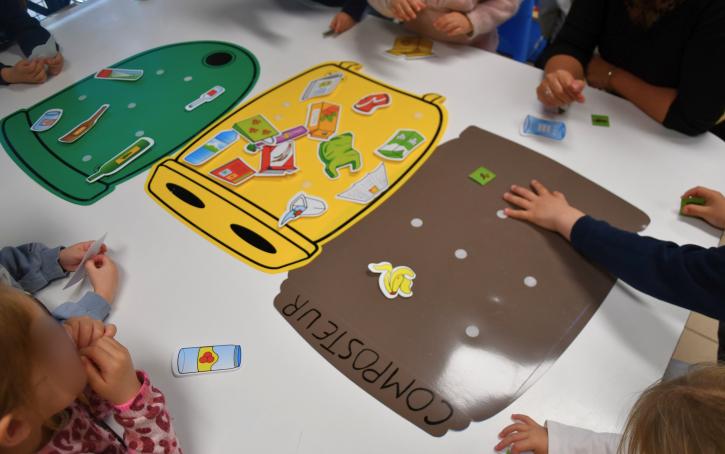 Quelques jours plus tard, les petites et moyennes sections ont vécu une animation ludique animée par Sabrina, spécialement conçue pour les plus jeunes. Au programme : la découverte de Lily le ver de terre à travers une histoire, des devinettes sensorielles pour apprendre à reconnaître les matériaux, et des jeux collectifs autour du tri. Pêche aux déchets, loto du tri, manipulation d'objets… autant d'activités conçues pour apprendre en s'amusant.