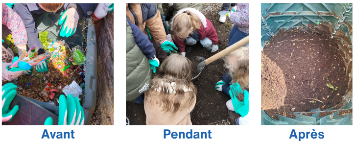 Les grandes sections et les CE1 ont bénéficié d'une séance consacrée au compostage. Surprise à l'arrivée : le composteur avait été confondu avec une poubelle ! L'occasion idéale pour une remise à niveau à la fois pédagogique et pratique. Retroussant leurs manches, les élèves ont trié, nettoyé et remis l'installation en état de marche. Le composteur est désormais opérationnel et prêt pour une nouvelle saison.