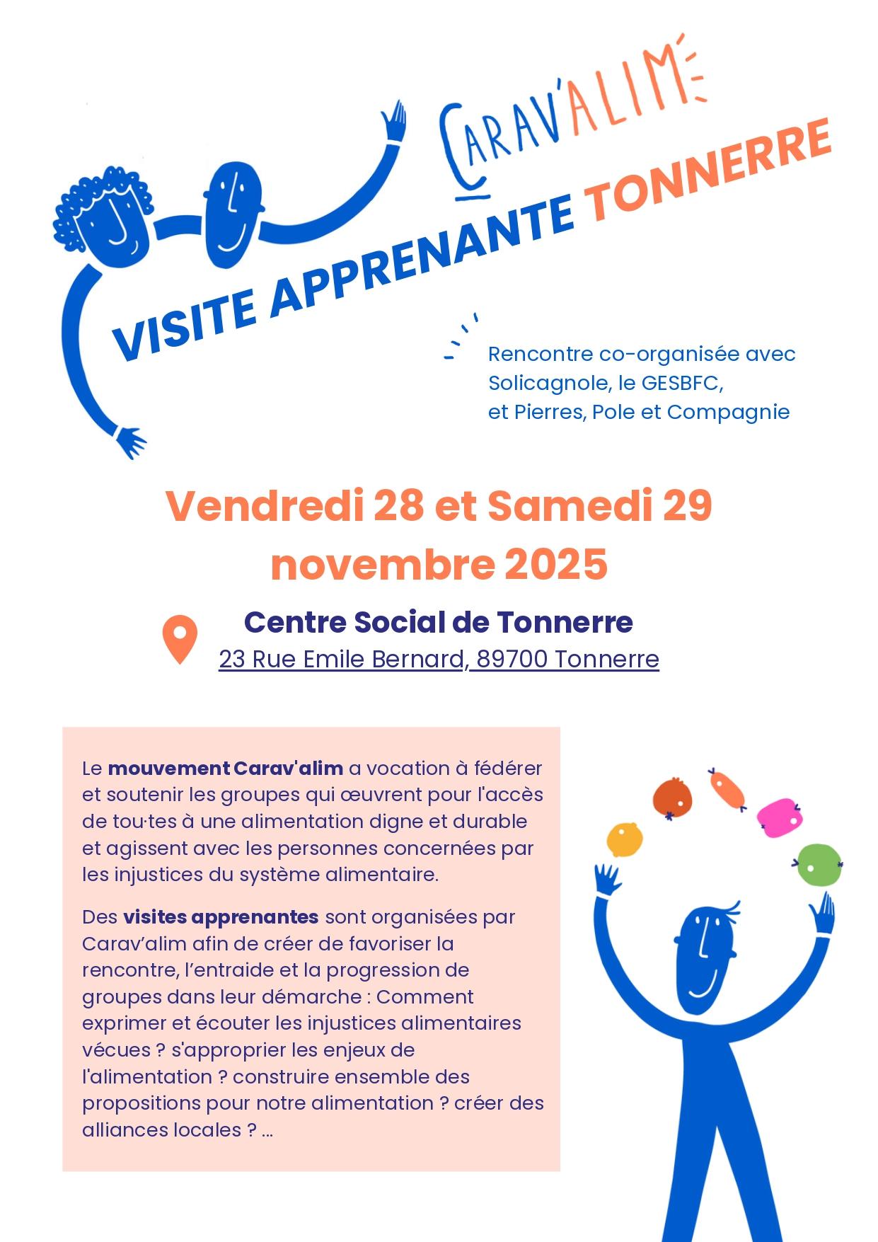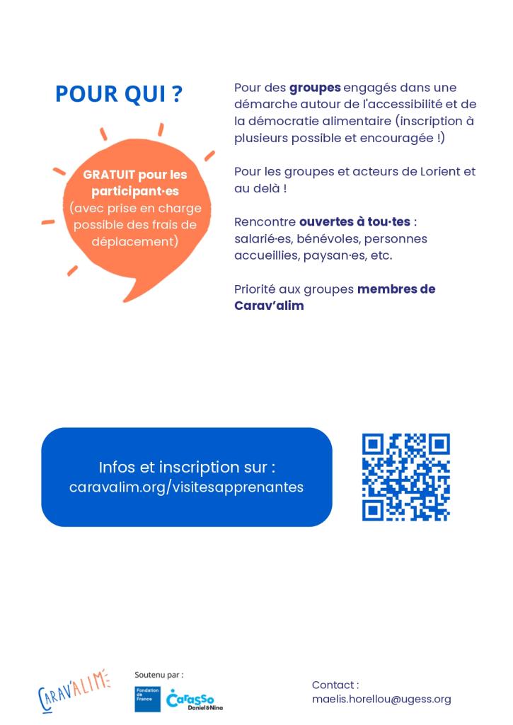 Le mouvement Carav'alim organise une rencontre pour fédérer et soutenir les groupes travaillant autour de l'accès à une alimentation digne et durable. Cette visite apprenante a pour objectif de favoriser l'entraide, la rencontre, et la progression des groupes dans leur démarche. Les participants auront l'opportunité de réfléchir ensemble à des solutions pour une alimentation plus juste, d'écouter les injustices alimentaires vécues et de collaborer pour construire des propositions concrètes. La rencontre est ouverte à tous les acteurs concernés par la démocratie alimentaire : salariés, bénévoles, personnes accueillies, paysans, etc.