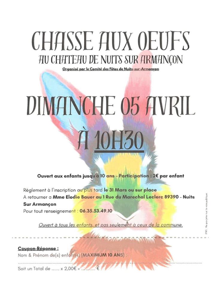 Inscription avant le 31 mars auprès de Mme Élodie Bauer - 1 rue du Maréchal Leclerc, 89390 Nuits-sur-Armançon, ou directement sur place.