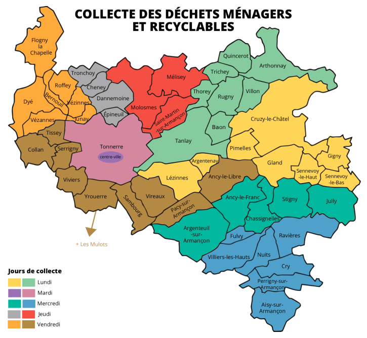 - Une collecte en porte à porte pour les ordures ménagère (bacs avec couvercles bordeaux) et les emballages recyclables (bacs avec couvercles jaunes).