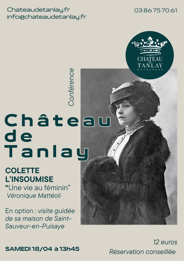 Pour débuter sa saison culturelle, le château de Tanlay vous propose le samedi 18 avril à 13h45 une conférence sur Colette, célèbre femme de lettres icaunaise, auteure des œuvres La Vagabonde et Les vrilles de la Vigne. A travers des ouvrages comme Claudine à l’école, Colette apparaît comme une femme engagée, qui n’hésite pas à critiquer la société de son temps.