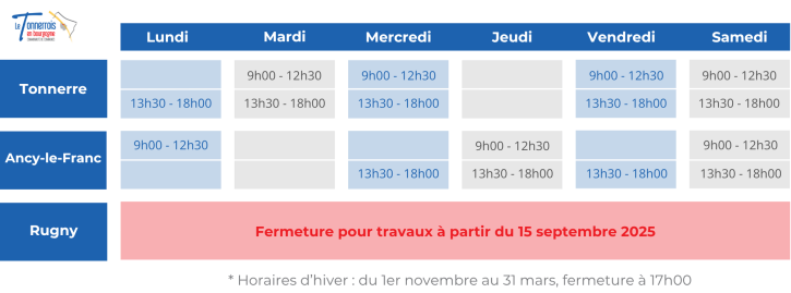 La communauté de communes gère 3 déchèteries : Tonnerre, Ancy-le-Franc et Rugny