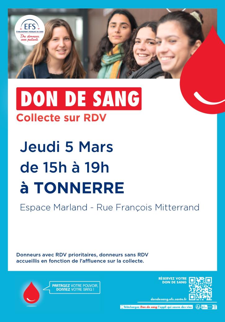 Une collecte de don de sang est organisée à Tonnerre par l’Établissement Français du Sang. Elle se déroulera le jeudi 5 mars, de 15h à 19h, à l’Espace Marland, rue François Mitterrand.