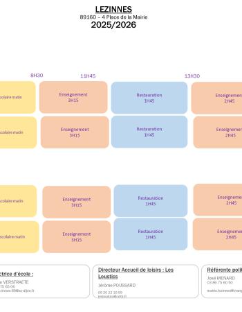 Horaires et informations Horaires école Lézinnes Consulter Taille : 126.98 Ko Extension du fichier : pdf Publié le 24 Oct. 2025 Menus Elite Restauration - Menus novembre, décembre 2025 Consulter Taille : 1.99 Mo Extension du fichier : pdf Publié le 13 Nov. 2025