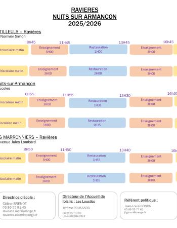 Horaires et informations Horaires école Ravières-Nuits Consulter Taille : 120.44 Ko Extension du fichier : pdf Publié le 24 Oct. 2025 Menus Elite Restauration - Menus novembre, décembre 2025 Consulter Taille : 1.99 Mo Extension du fichier : pdf Publié le 13 Nov. 2025