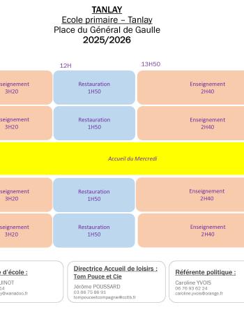 Horaires et informations Horaires école Tanlay Consulter Taille : 131.59 Ko Extension du fichier : pdf Publié le 24 Oct. 2025 Menus Elite Restauration - Menus novembre, décembre 2025 Consulter Taille : 1.99 Mo Extension du fichier : pdf Publié le 13 Nov. 2025