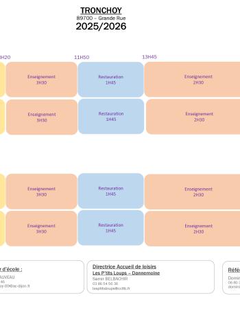 Horaires et informations Horaires école Tronchoy Consulter Taille : 105.67 Ko Extension du fichier : pdf Publié le 24 Oct. 2025 Menus Elite Restauration - Menus novembre, décembre 2025 Consulter Taille : 1.99 Mo Extension du fichier : pdf Publié le 13 Nov. 2025