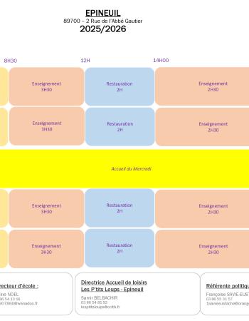 Horaires et informations Horaires école Épineuil Consulter Taille : 123.73 Ko Extension du fichier : pdf Publié le 24 Oct. 2025 Menus Elite Restauration - Menus novembre, décembre 2025 Consulter Taille : 1.99 Mo Extension du fichier : pdf Publié le 13 Nov. 2025