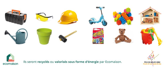 - Les jouets cassés : trotteurs, jeux d’extérieurs comme les piscines, jeux d’imitation (poupées, puzzles, jeux de société, peluches), véhicules à pédales…