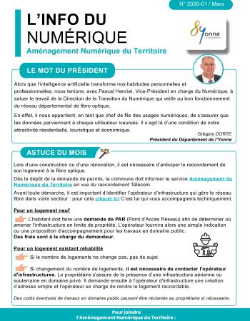 Découvrez la lettre d'information du numérique n°1 2026 du Département de l'Yonne Lettre d'information du numérique n°1 2026 Consulter Taille : 690.9 Ko Extension du fichier : pdf Publié le 20 Mar. 2026 Retour à la liste Retour à la liste