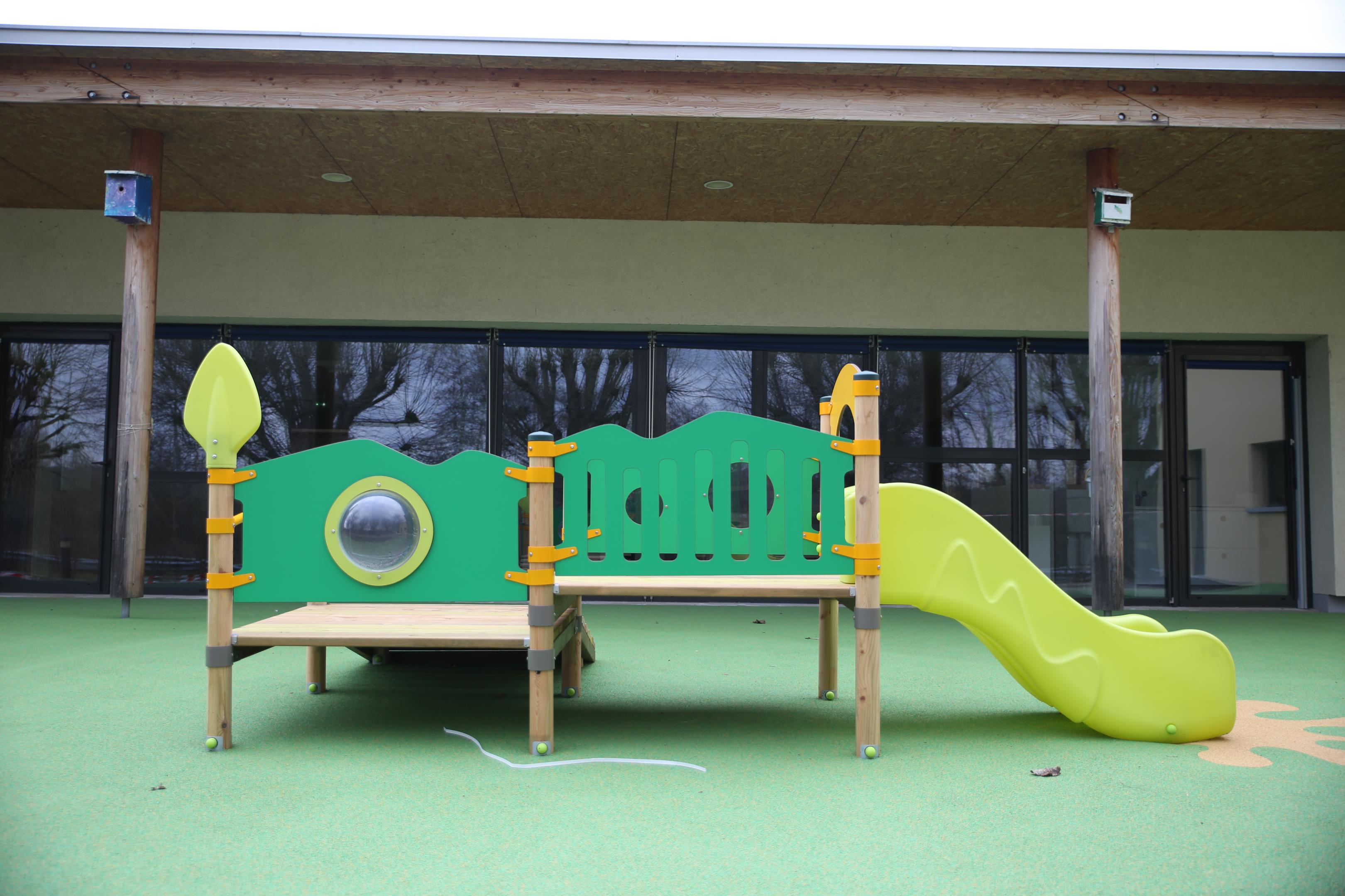 Elle possède également une salle de motricité, une salle de jeux d’eau, et un grand espace extérieur.