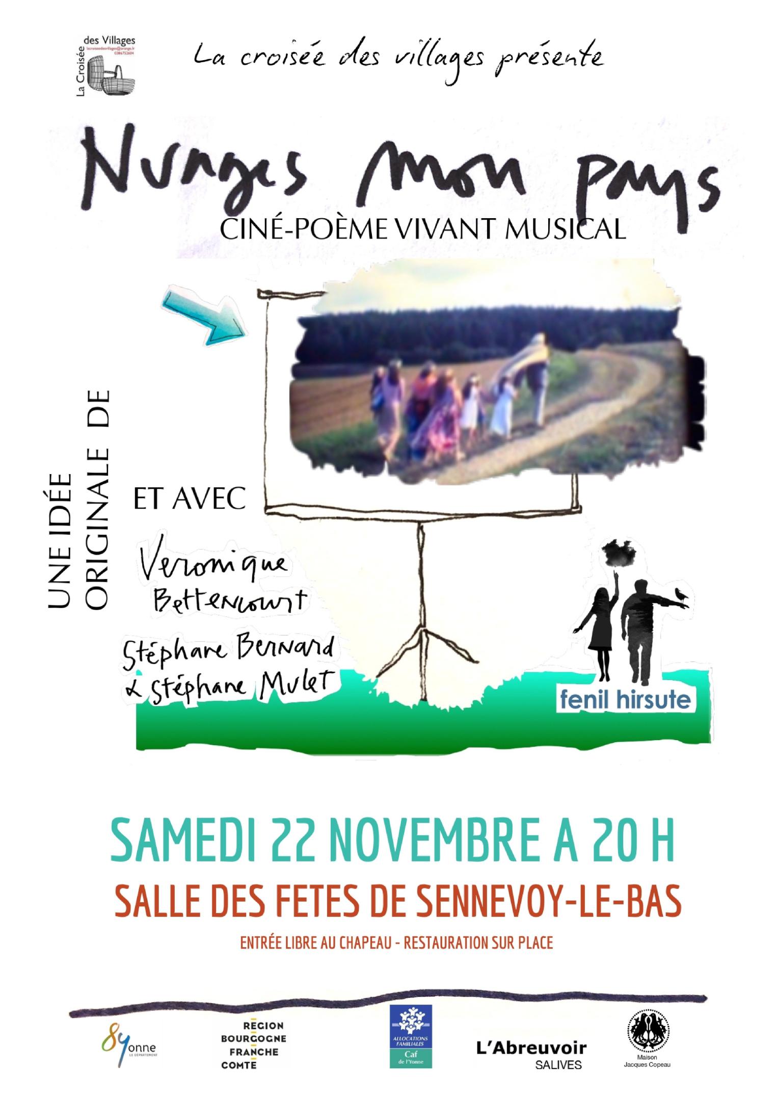 Nurgas mon pays est un ciné-poème vivant musical, une création originale qui mêle film, musique et poésie. Ce spectacle unique est conçu par Véronique Bettencourt, Stéphane Bernard et Stéphane Mulet. Il invite le public à une expérience immersive où les images et les sons se rencontrent pour célébrer la beauté et la poésie du monde rural. Il sera possible de vous restaurer sur place.