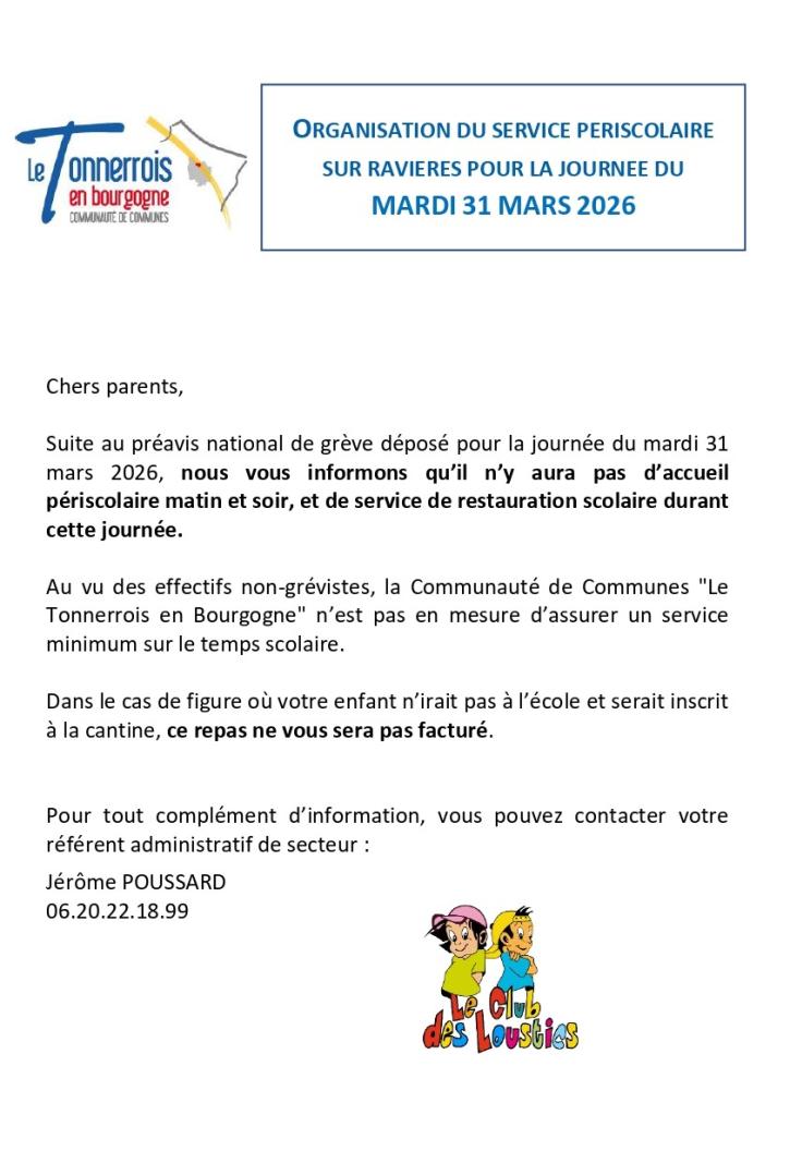 Suite au préavis national de grève, il n'y aura pas d'accueil périscolaire (matin et soir) ni de restauration scolaire ce mardi 31 mars sur Ravières.