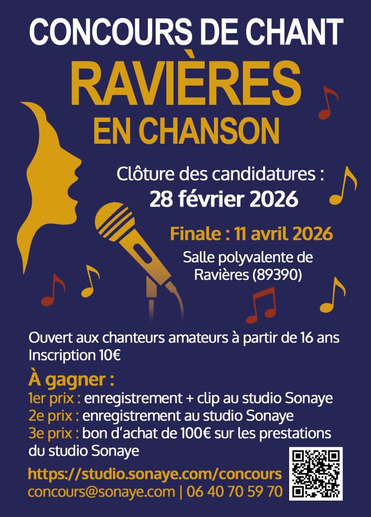 « Ravières en chanson » est un concours destiné aux chanteurs amateurs, à partir de 16 ans, souhaitant vivre une expérience artistique enrichissante. Cet événement met en valeur les talents vocaux locaux et offre aux participants l’occasion de se produire sur scène devant un public et un jury.