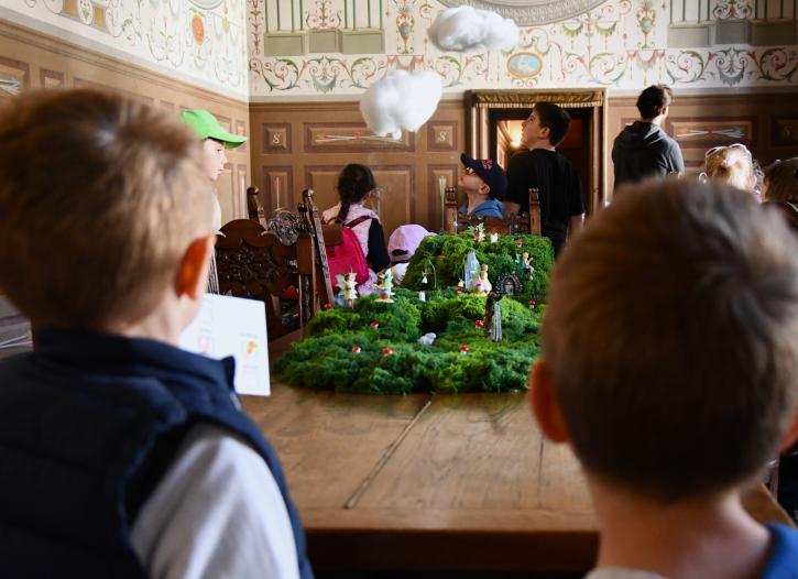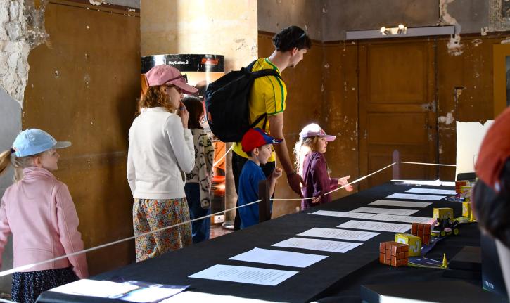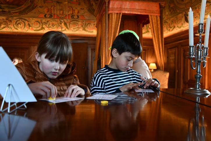 Place ensuite au grand défi ! Munis de leur carte des 7 défis, les enfants ont sillonné les salles et les couloirs du château à la recherche d'objets cachés et de représentations dissimulées sur les murs et les plafonds. Peintures, sculptures, détails architecturaux… rien n'a échappé à leurs yeux de détectives en herbe ! À chaque défi relevé, un tampon venait valider leur progression sur la carte. Une activité mêlant observation, curiosité et esprit d'équipe, idéale pour explorer le patrimoine autrement.